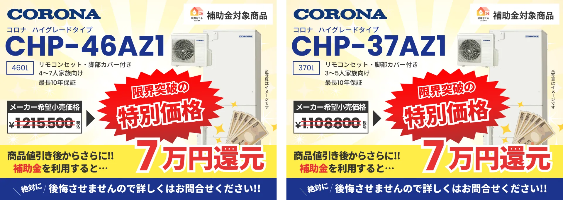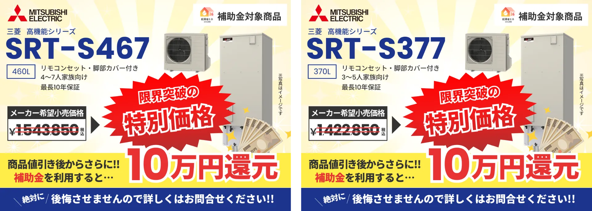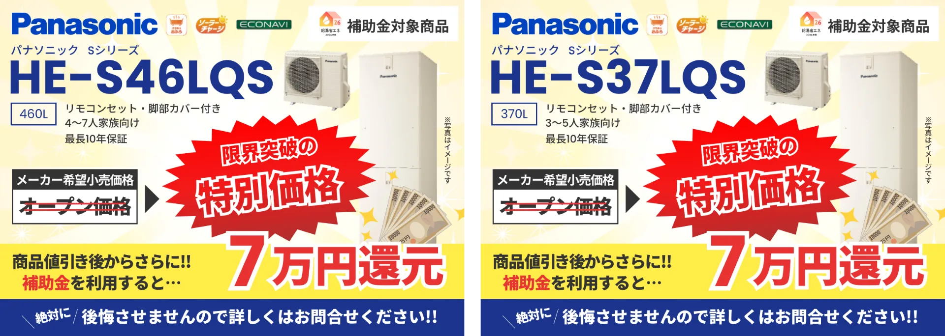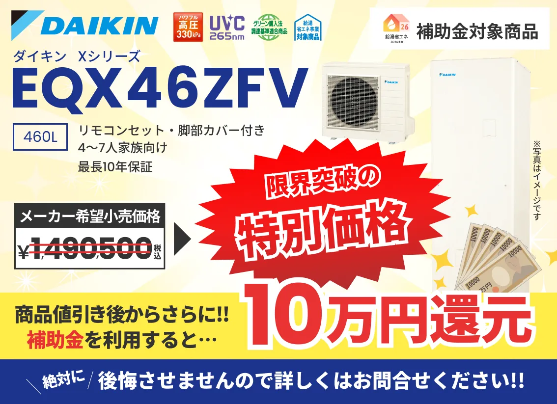 ※表示価格はエコキュート本体価格となり、別途、取付工事費が発生いたします。工事費は現地状況により異なりますが、できる限りご満足いただける価格で施工いたしますのでお気軽にご相談ください。