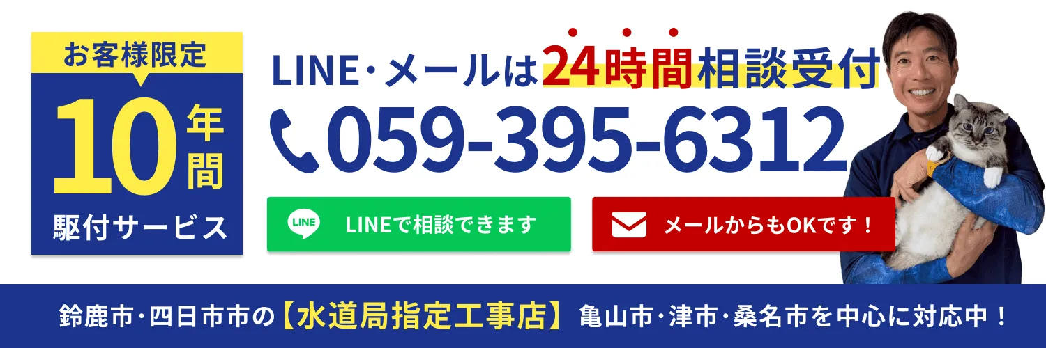 突然のトイレ水漏れは、多くの不安と不便をもたらします。しかし、それは単なる修理だけでなく、老朽化したトイレを見直し、最新の節水型トイレへとリフォームする絶好のチャンスでもあります。水漏れを根本から解決するだけでなく、水道代の節約、日々の清掃性の向上、そしてデザイン性や快適機能の充実といった多大なメリットが得られます。当社の迅速な水漏れ修理サービスと、安心の料金体系を活用し、水漏れの不安を解消しながら、あなたにとって最適なトイレ空間を実現しましょう。当店は、三重県鈴鹿市で対面の相談窓口や非対面のLINEでのご相談も受け付けておりますので、お気軽にご相談ください。水漏れなどの緊急性の高い場合でも、迅速対応ができるよう24時間相談受付体制を整えておりますのでご安心ください。
