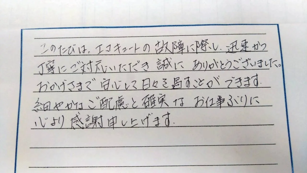 【お客様の声】「このたびは、エコキュートの故障に際し、迅速かつ丁寧に対応いただき誠にありがとうございました。おかげさまで安心して日々を過ごすことができます。細かなご配慮と確実なお仕事ぶりに心より感謝申し上げます。」