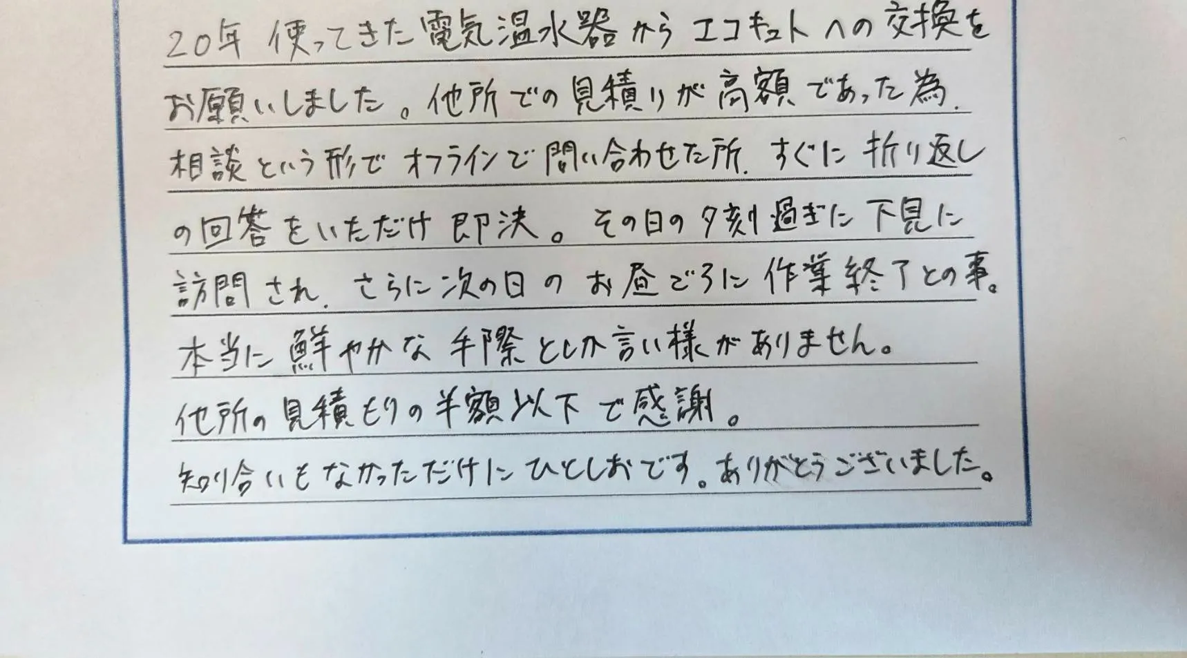 【お客様の声】「20年使ってきた電気温水器からエコキュートへの交換をお願いしました。他所での見積りが高額であった為、相談という形でオフラインで問い合わせた所、すぐに折り返しの回答をいただけ即決。その日の夕方過ぎに下見に訪問され、さらに次の日のお昼ごろに作業終了との事。本当に鮮やかな手際としか言い様がありません。他所の見積もりの半額以下で感謝。知り合いもなかっただけにひとおしです。ありがとうございました。」