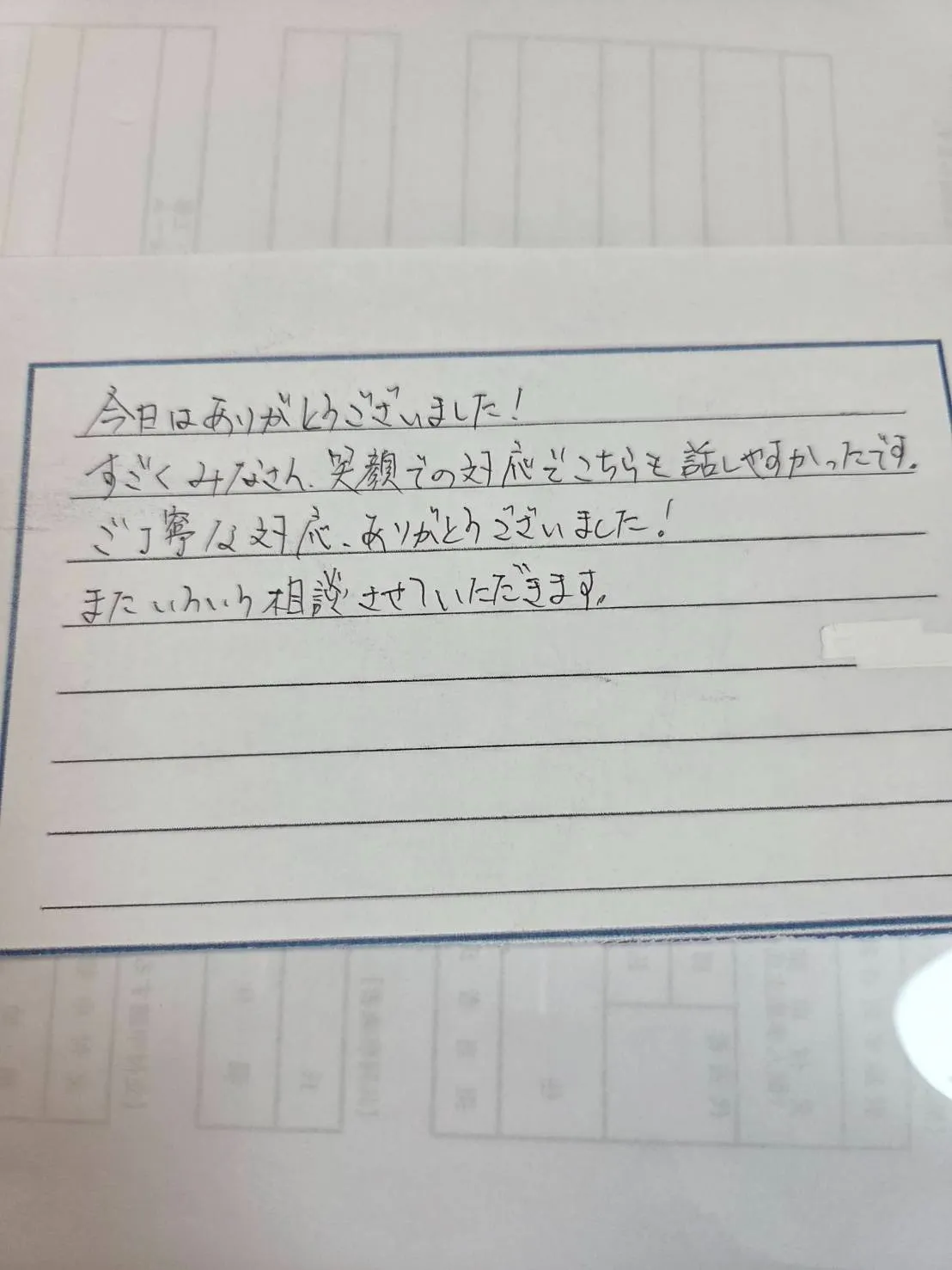 【お客様の声】「今日はありがとうございました!すごくみなさん、笑顔での対応でこちらも話やすかったです。ご丁寧な対応、ありがとうございました!また、いろいろ相談させていただきます。」