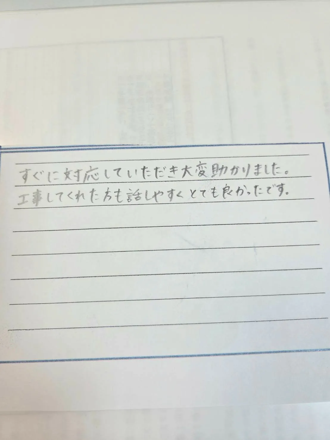 【お客様の声】「すぐ対応していただき大変助かりました。工事してくれた方も話やすくとても良かったです。」