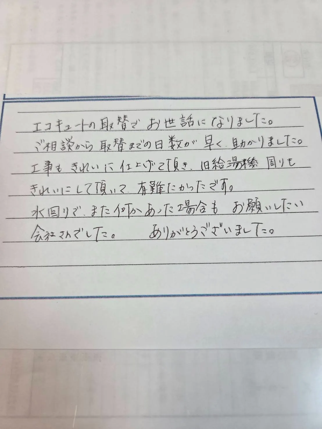 【お客様の声】「エコキュートの取替でお世話になりました。ご相談から取替までの日数が早く助かりました。工事もきれいに仕上げて頂き、旧給湯器周りもきれいにして頂いて有難かったです。水回りでまた何かあった場合もお願いしたい会社さんでした。ありがとうございました。」