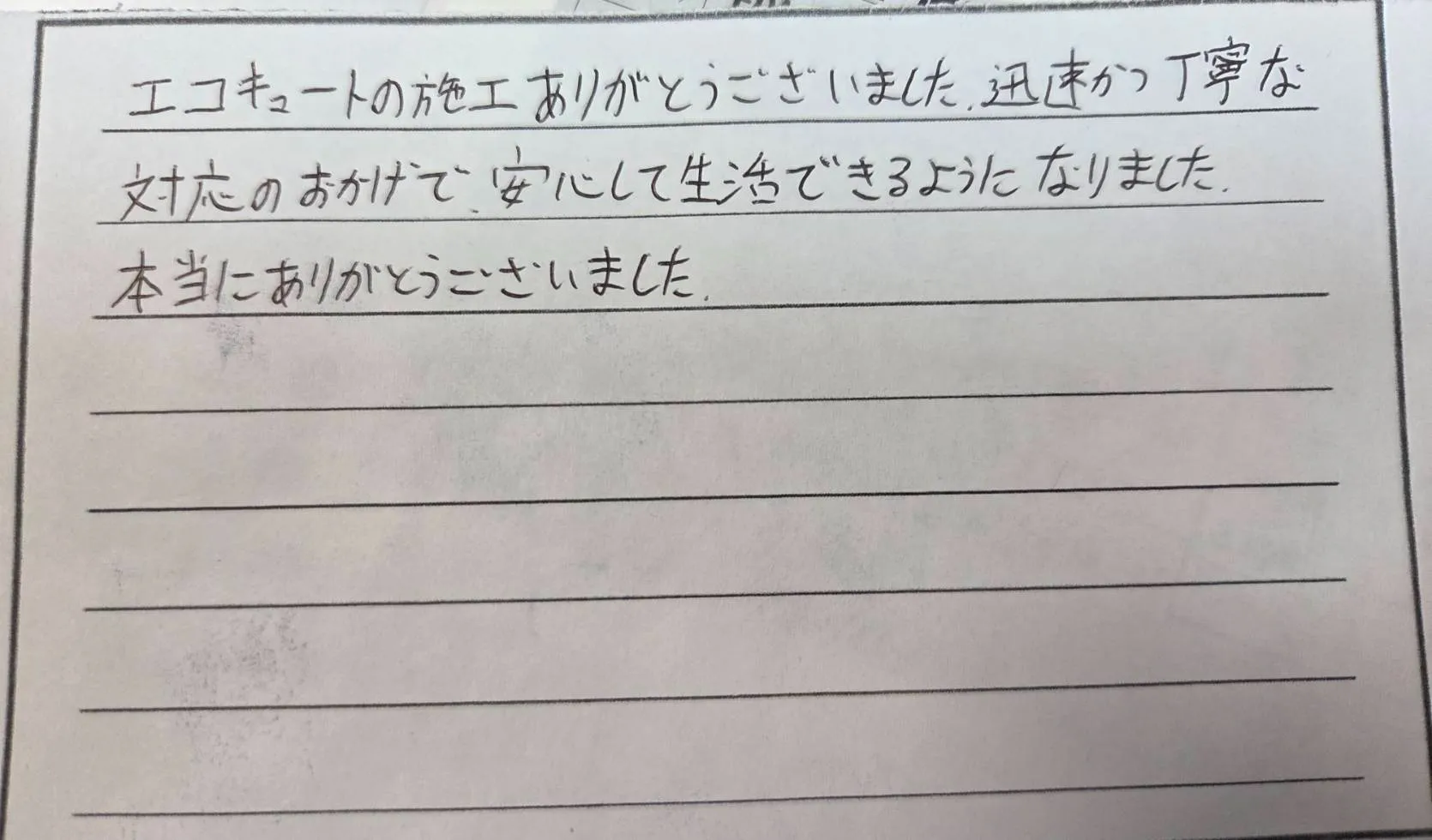 【お客様の声】「エコキュートの施工ありがとうございました。迅速かつ丁寧な対応のおかげで安心して生活できるようになりました。本当にありがとうございました。」