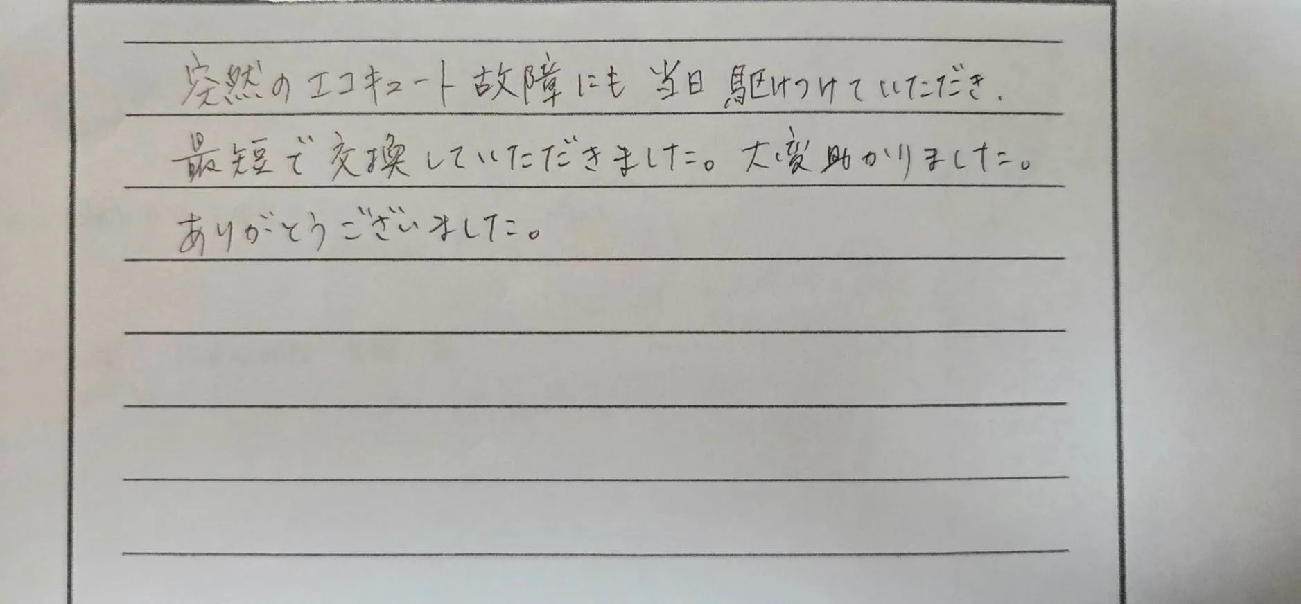 【お客様の声】「突然のエコキュート故障にも当日駆けつけていただき、最短で交換していただきました。大変助かりました。ありがとうございました。」