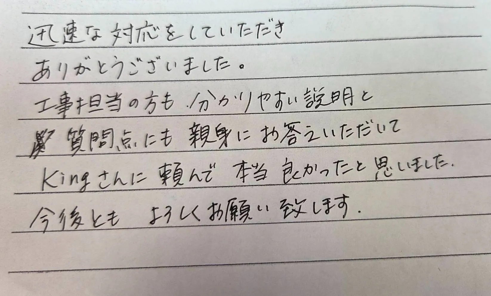 【お客様の声】「迅速な対応をしていただきありがとうございました。工事担当の方も分かりやすい説明と質問点にも親身にお答えいただいてKingさんに頼んで本当良かったと思いました。今後共よろしくお願い致します。」