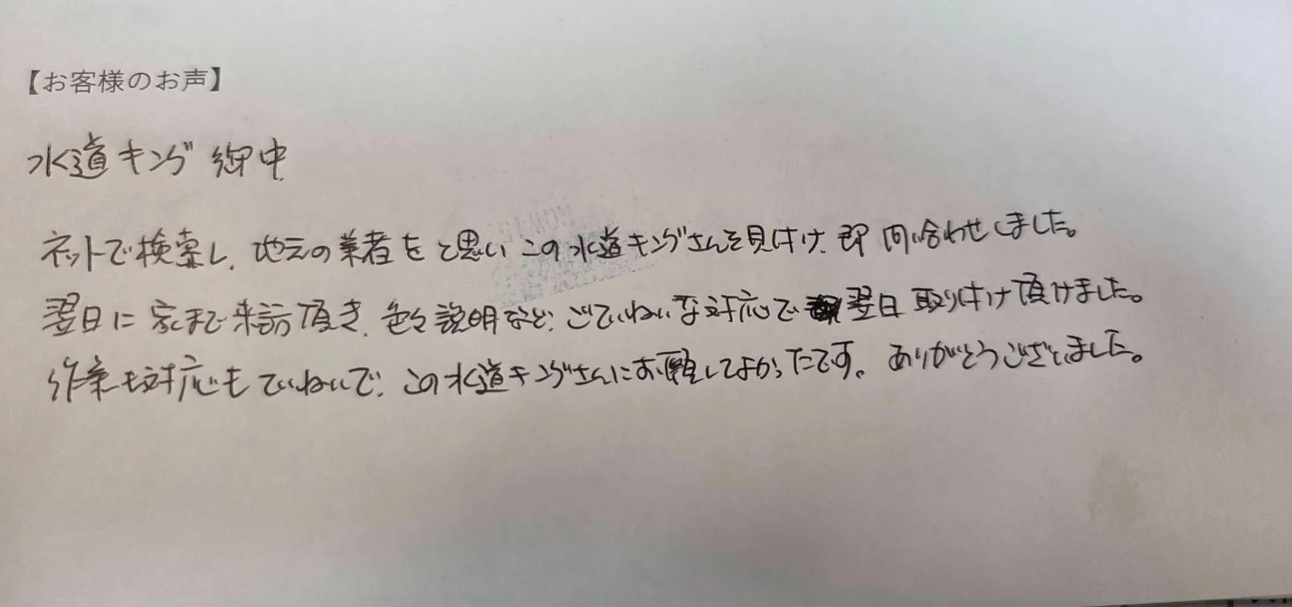 【お客様の声】「ネットで検索し、地元の業者をと思いこの水道キングさんを見つけ、即問い合わせしました。翌日に家まで来訪頂き、色々説明など、ごていねいな対応で翌日取り付け頂けました。作業も対応もていねいで、この水道キングさんにお願いしてよかったです。ありがとうございました。」