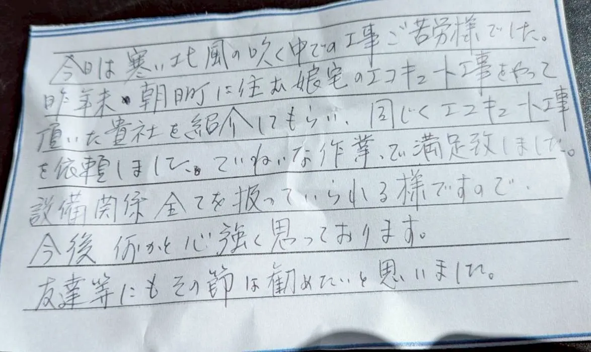 ご親族からのご紹介で水道キングをご利用いただき誠にありがとうございました!大切なご縁をきっかけにご相談いただけたことを心より嬉しく思っております。水道キングでは、エコキュートの交換をはじめとした水まわり工事において、丁寧で分かりやすい説明と高品質な施工を徹底しております。初めての方でも安心してお任せいただけるよう、ご要望やご予算に合わせた最適なご提案を行い、無理のない工事を心がけております。